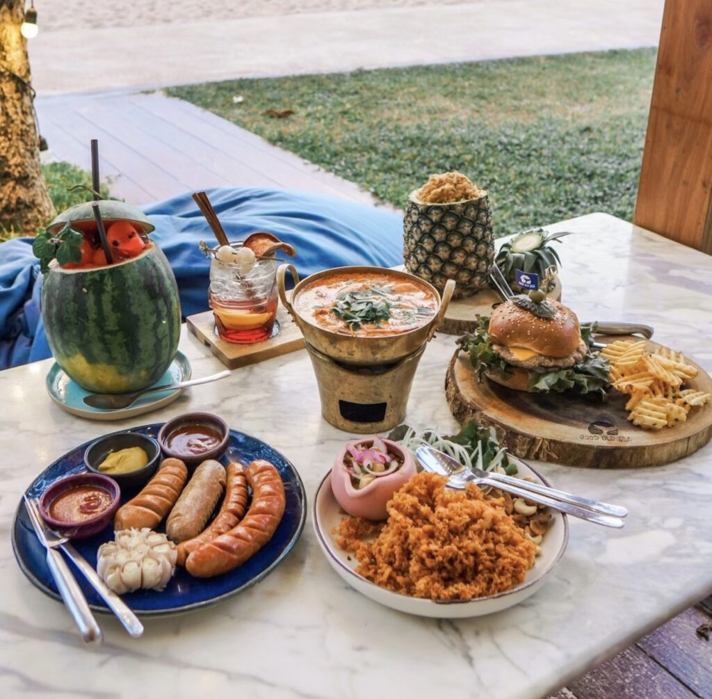 Seating: The venue features a mix of dining areas, including a normal cafe/restaurant section (indoor/air-conditioned), and an outdoor zone right by the sea. The outdoor area is perfect for chilling, especially around 4-5 PM to watch the spectacular sunset. You can find comfortable seating options, including traditional tables and even bean bags on the sand.